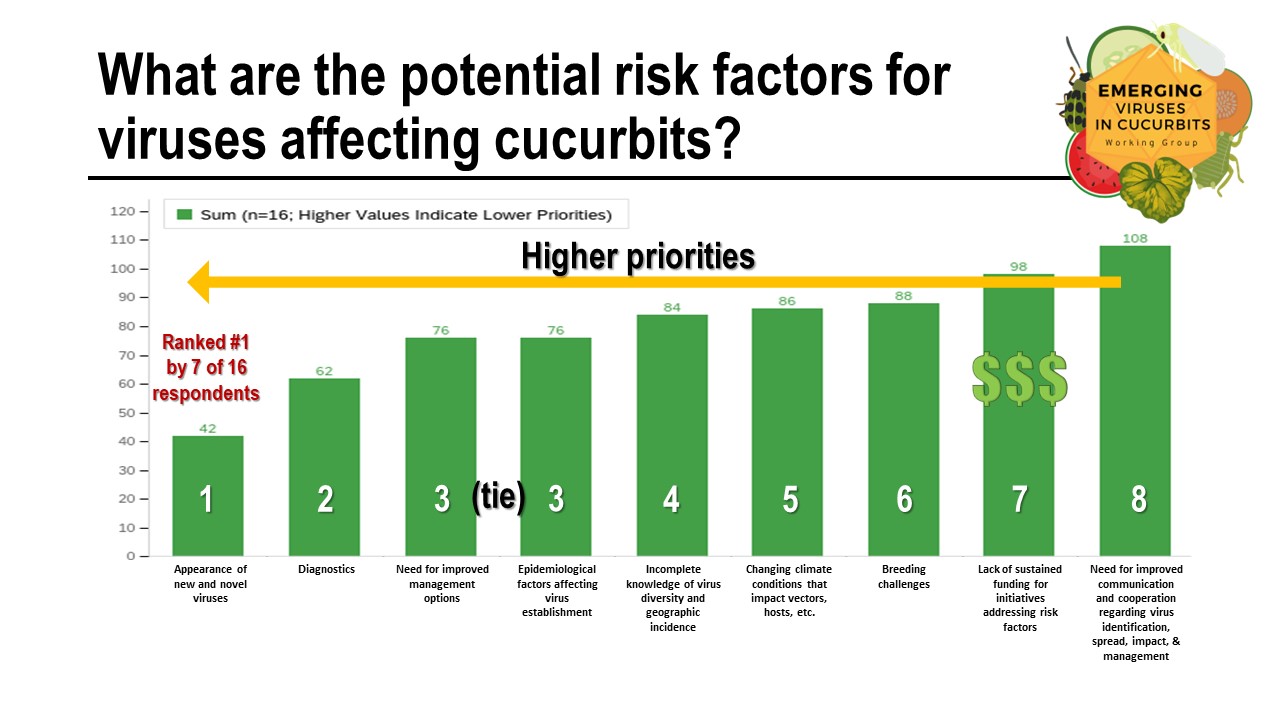 The EVCWG will identify and prioritize potential risk factors for viruses affecting cucurbits, known and potential virus threats, mitigation strategies for these viruses, and methods to reduce virus threats and will determine the best approaches to address these issues. Members will work to increase knowledge and awareness of virus threats among members of the cucurbit industry through the delivery of educational presentations and the development of educational resources that will be posted to the EVCWG website (www.eCucurbitviruses.org). Through these activities and resources, the EVCWG will improve awareness, identification, and management of existing and new viruses across the cucurbit industry in the United States that will ultimately help to decrease virus introduction/spread and associated yield losses and lead to improved stability and profitability within the cucurbit industry.