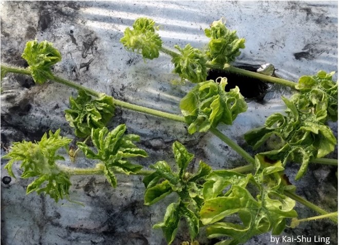 Watermelon plants infected with CuLCrV typically first show symptoms in new leaves, including the striking crumpling and downward curling. Leaves become pale green to yellow and show varying degrees of stunting, distortion, and mottling (Figures 1 and 2). Internode length of vines is not typically affected. Once plants are infected and symptoms begin to develop, fruits are no longer set. Fruit on infected plants may fail to mature and are not marketable due to unsightly bumps or irregularities. In the southeastern United States and the Yucatan Peninsula of Mexico, watermelon yields can be reduced by CuLCrV (Keinath et al., 2018, Plant Health Prog. 19; Rodríguez-Negrete et al., 2021, Plant Dis. 105).